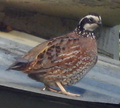 Our new best buddy, the urban quail, was back this evening. He spotted the monster kitteh and decided that the view from above Lizzie’s porch was preferred to the view from under Lizzie’s porch.