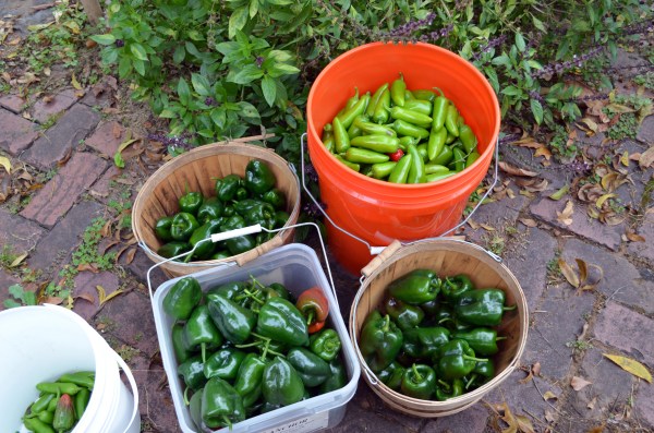 The 5 gallon bucket sharing this picture with the poblano harvest offers “proof of jalapeno bounty”: