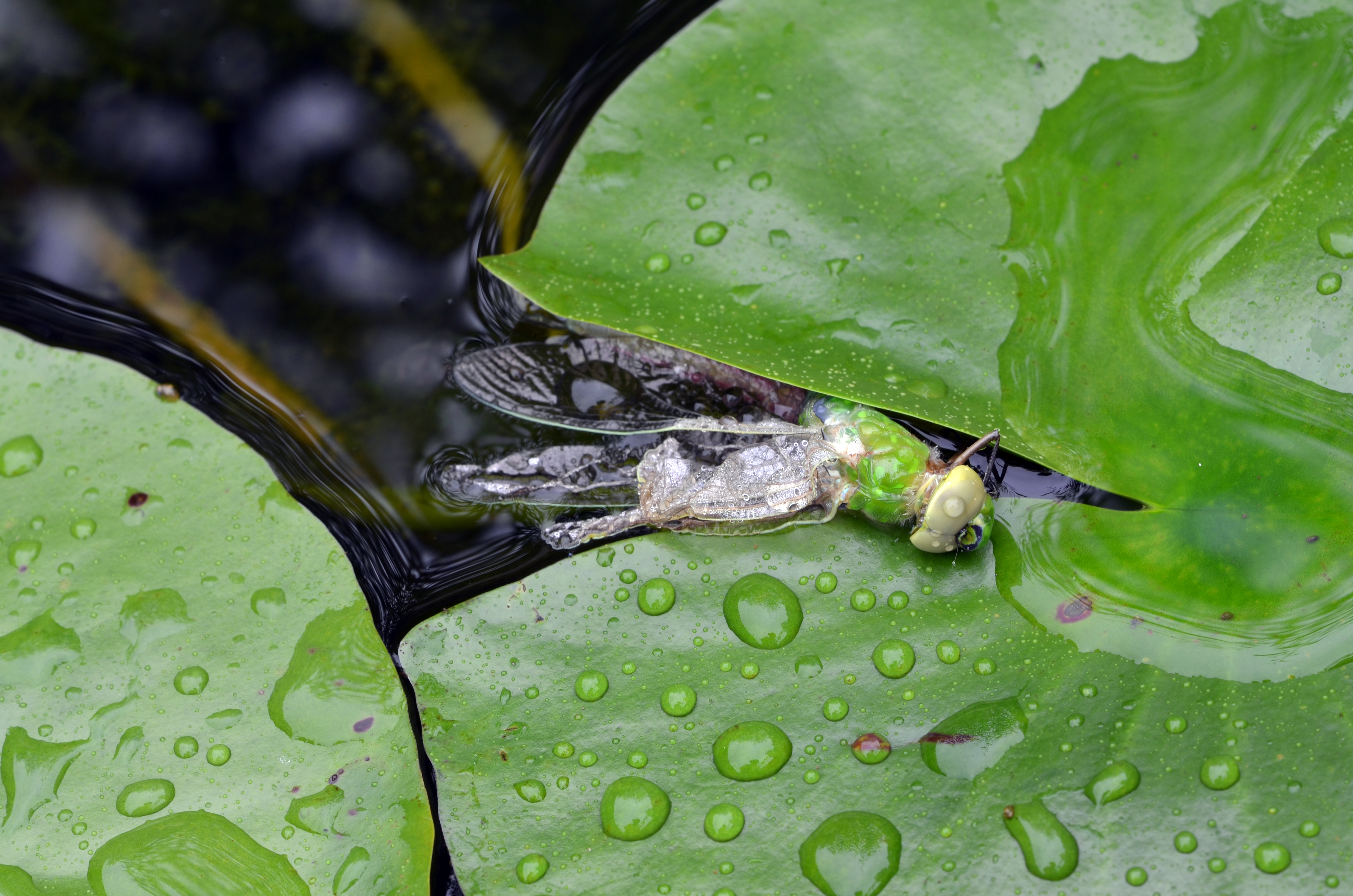 Nearby, like a castaway who has just pulled himself ashore from a shipwreck, one of the emerged dragonflies was halfway out of the water, seemingly resting on the edge of a partially submerged lily pad. I noted that it was in a particularly vulnerable spot, served up very close to the edge of the pond as birds began their morning activities. Rather than trying to move this one in its still soft state, I suspended some plastic fencing over that part of the pond to deter birds from snatching it up.