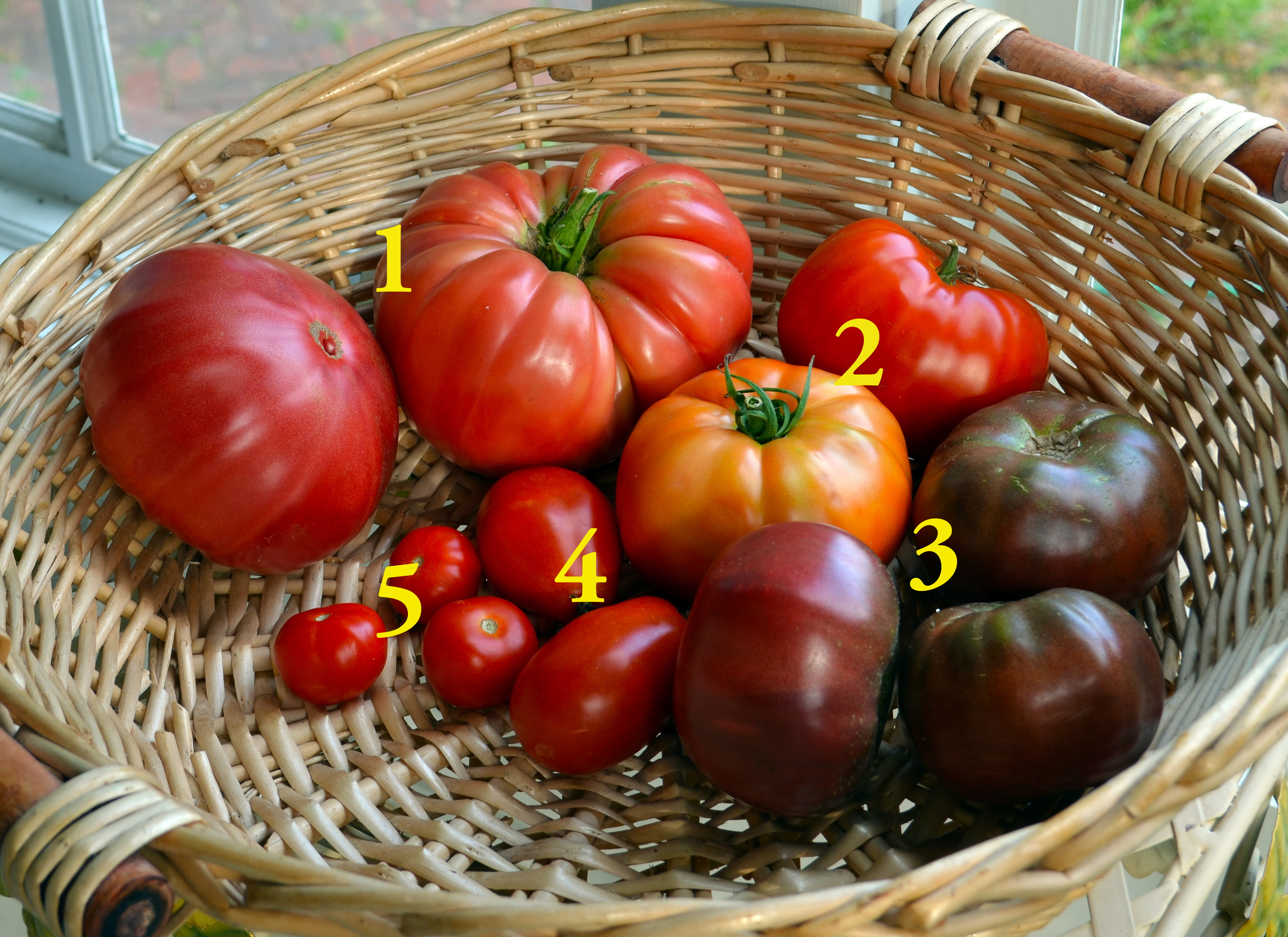 1. Brandywine, an heirloom beefsteak purported to have been in Burpee’s catalog in the 1880s before disappearing for some years. Returned to circulation when Doris Sudduth Hill of Ohio gave some seeds to Seed Savers Exchange in 1982. Giant leaves shade slow ripening, pinkish fruit that are sometime ridiculously large. Average yield at best but among highest rated in flavor.